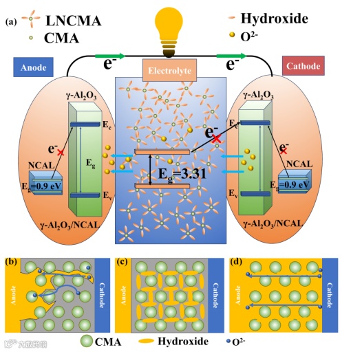 图1.(a)γ-Al2O3/NCAL电极LNCMA电池的示意图和能带结构;(b)CMA电池;(c) 测试前LNCMA电池以及(d) 测试后LNCMA电池中的熔融氢氧化物流动联通的渝渗模型。