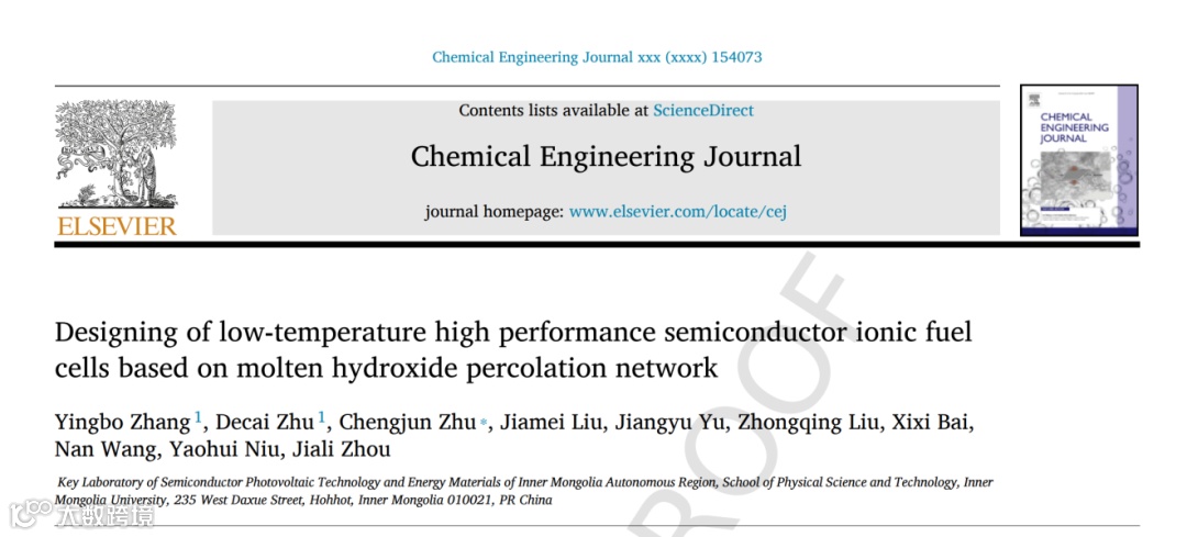 近日,来自内蒙古大学物理科学与技术学院朱成军教授课题组的张英博博士和朱德才博士作为共同第一作者,在国际知名期刊Chemical Engineering Journal上发表题为“Designing of low-temperature high performance semiconductor ionic fuel cells based on molten hydroxide percolation network”的观点文章。该观点文章设计了熔融氢氧化物渝渗联通网络模型的SIMFCs单电池器件,该器件实现了550 ℃(1.123V的OCV,1111 mW·cm-2的MPD)和350 ℃ (1.181V的OCV,114 mW·cm-2的MPD)的超高输出性能,以及40 h的良好的稳定性。这种基于熔融氢氧化物渝渗联通网络模型的设计,提供了一种直接有效的开发高性能低温半导体离子膜燃料电池的方法。