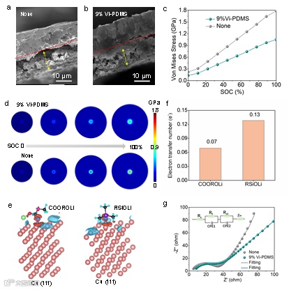 利用SEM对循环后的Si/C负极进行表征,观察到使用添加剂的电池表面光滑,与Cu集流体结合力强。利用有限元模拟和DFT计算来了解以上性能增强的原因。随着充电的进行,颗粒发生膨胀变形,从而改变颗粒与集流体之间的力。含有添加剂的负极可以有效降低颗粒与集流体接触面的应力集中,降低膨胀力引起颗粒脱落的风险。另外,研究发现含Si界面层与Cu之间的吸附能较高。含Si的大分子锂盐界面层不仅增强了界面应力,而且在改善结合力、防止Si从集流体上脱落方面起着不可或缺的作用。