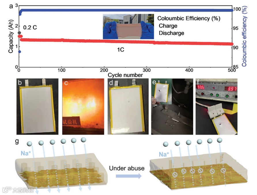 组装成的anode-less全电池器件具有高能量密度(>200Wh/kg),并表现出良好的循环稳定性。隔膜及SEI层的热稳定性,致使电池展现出较好的安全性,可以通过穿刺实验。隔膜加热至高温,没有明显的热收缩,而隔膜的离子通路孔道却有一定的收缩,致使电池表现出好的热稳定性,并在高温下以及保持良好的性能。