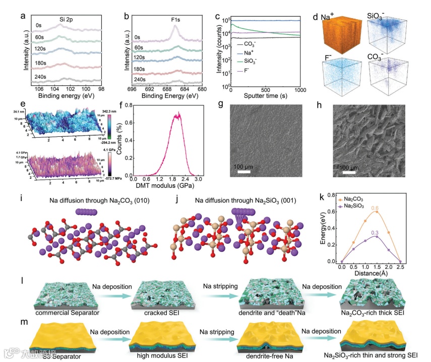 为设计高稳定性、高模量的富含高钠离子传导性Na2SiO3的SEI层,设计出薄而致密坚固的隔膜,改善了隔膜的离子电导率和热稳定性,并展现出优异的机械性能和表面模量,从而抑制枝晶生长。