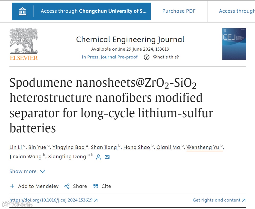 近日,长春理工大学董相廷教授团队在一区Top期刊《Chemical Engineering Journal》上,发表了最新研究成果“Spodumene Nanosheets@ZrO2-SiO2Heterostructure Nanofibers Modified Separator for Long-cycle Lithium-sulfur Batteries”。研究者提出了一种新的策略,将1D的ZrO2-SiO2异质结构纳米纤维与2D的层状锂辉石纳米片复合,构建Spodumene@ZrO2-SiO2作为中间层,对常规PP隔膜进行改性,从而获得更优秀的长周期Li-S电池改性隔膜。在该复合结构中,ZrO2-SiO2异质结构纳米纤维为锚定多硫化锂提供了丰富的活性位点,促进了多硫化锂的催化转化,而天然锂辉石纳米片则提供了选择性的Li+传输通道,即锂辉石纳米片作为Li+筛,允许Li+快速传输,同时由于其小尺寸通道造成的空间阻塞效应,抑制了多硫化锂的穿梭效应,实现了催化、阻挡多硫化锂的双重功能,有效提升了锂硫电池正极的电化学性能。