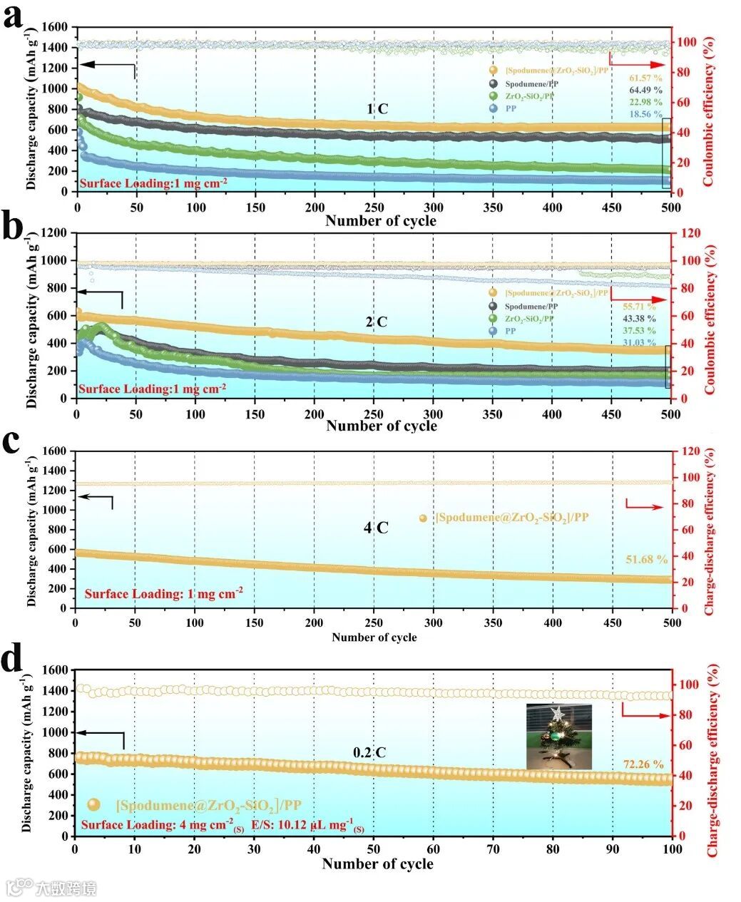 图6. 采用不同改性隔膜装配的锂硫电池在(a)1 C; (b) 2 C; (c) 4 C的电流密度下的长循环稳定性测试, (d) 在高面载的条件下,使用[Spodumene@ZrO2-SiO2]/PP作为隔膜组装的锂硫电池在0.2 C的电流密度下的长循环性能图。
