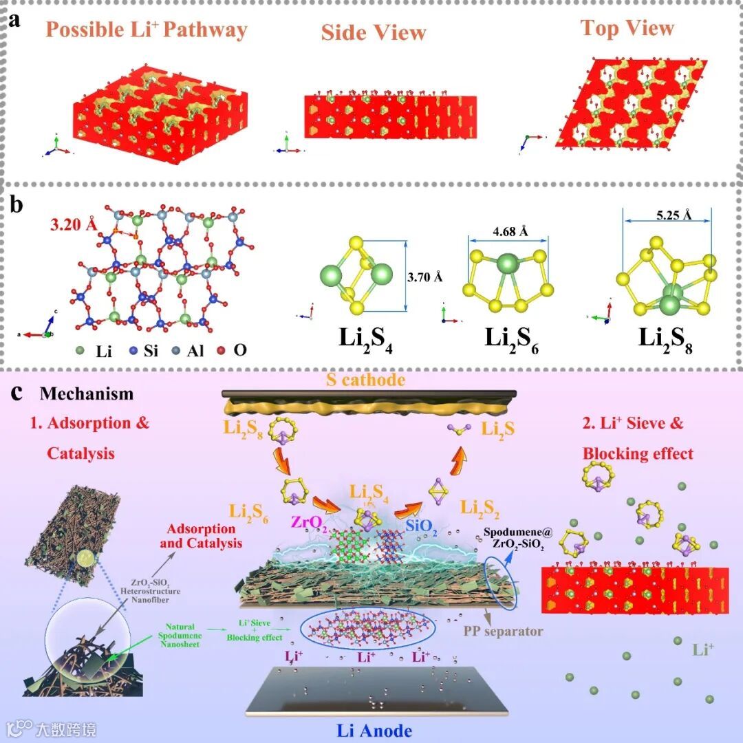 图8. Spodumene(a) 存在的锂离子扩散路径,(b) 与LiPSs分子的晶格尺寸比较,(c) [Spodumene@ZrO2-SiO2]/PP抑制多硫化物穿梭效应的机理示意图。
