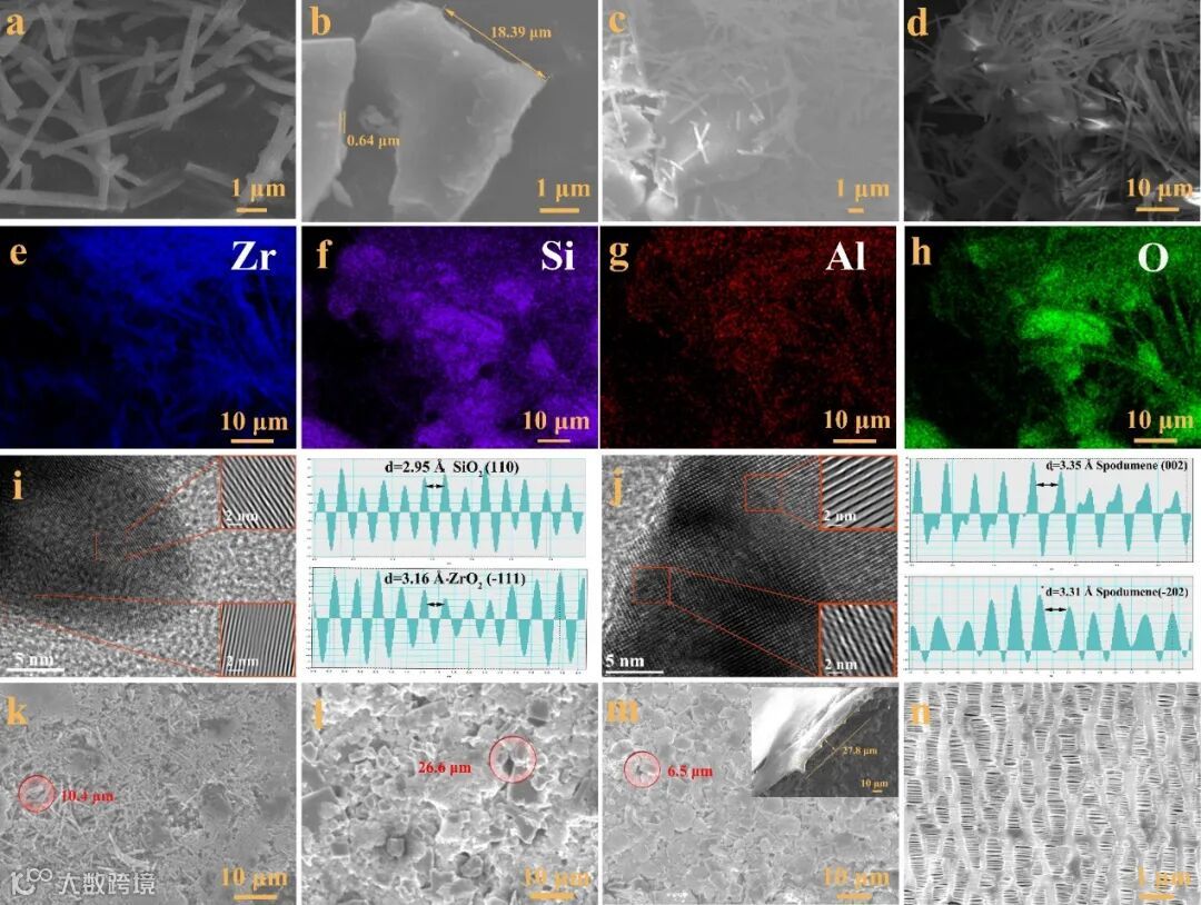 图2. Spodumene; ZrO2-SiO2和Spodumene@ZrO2-SiO2的SEM, EDS, TEM, 及HRTEM形貌表征。