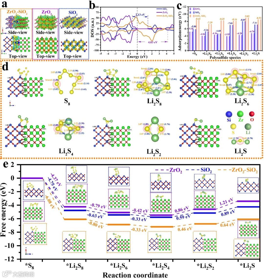 图7. DFT计算(a) 差分电荷密度,(b) 态密度,(c) 对不同多硫化物的吸附能,(d) ZrO2-SiO2对不同多硫化物吸附的位点分析和 (e) 不同催化剂对多硫化物转化反应的吉布斯自由能变。