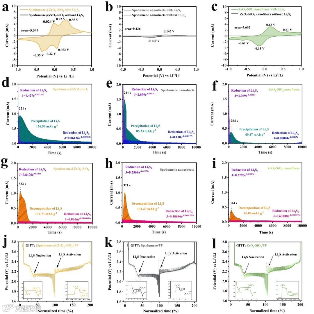 图4. 不同改性隔膜装配的(a-c)对称电池测试曲线,(d-f) Li2S沉积测试曲线,(g-i) Li2S溶解测试曲线,(j-l) GITT测试曲线。