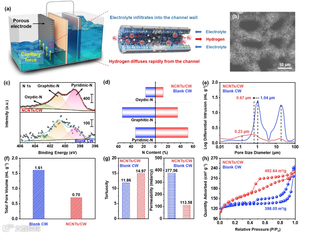 图2. a) 准气相反应体系示意图;b) NCNTs/CW 的扫描电镜图像;c) N 1s XPS 光谱;d) 各N物种的百分比含量;e) 孔径分布;f) 孔隙体积;g) 曲度和汞渗透率;h) N2 吸附/解吸等温线。