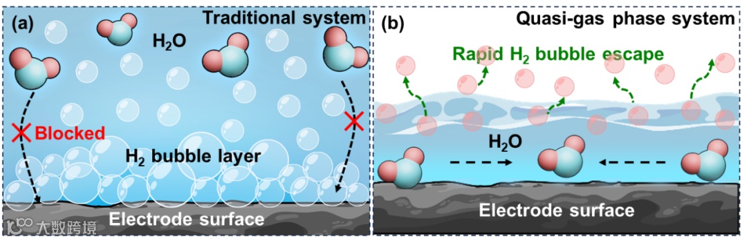 图 5. a) 传统液相反应体系和b)准气相反应体系中HER 过程的物料传质模型示意图。
