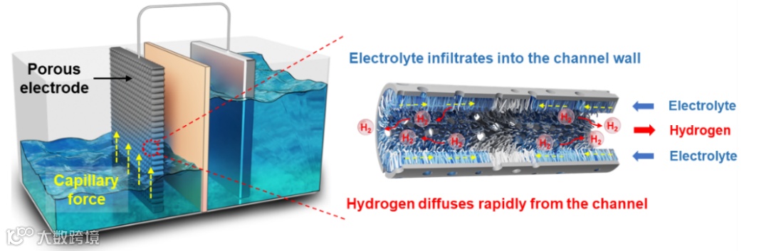 图1. 准气相电解水反应体系及NCNTs/CW多孔电极的结构示意图。