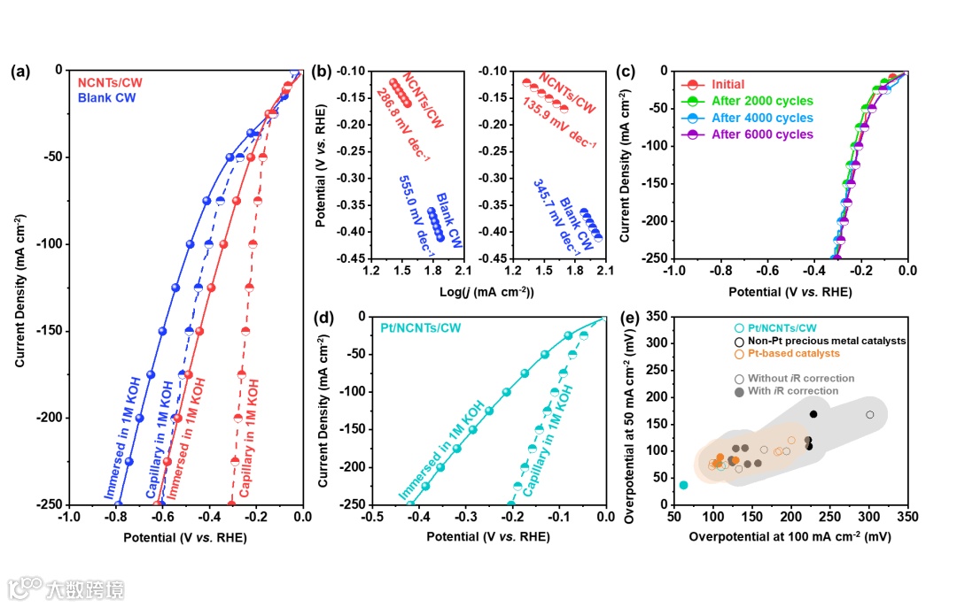 图3. a) NCNTs/CW 和 Blank CW 在不同测试系统中的 LSV 曲线和 b) Tafel 斜率;c) NCNTs/CW 在准气相反应体系中不同循环圈数后的 LSV 曲线;d) Pt/NCNTs/CW 在不同测试体系中的 LSV 曲线;e) 本研究和文献中催化电极在 50 mA cm-2 和 100 mA cm-2 下的过电势。