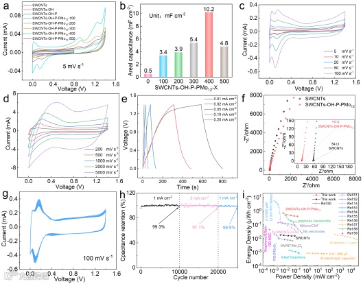 本工作通过静电相互作用将PMo12团簇均匀地锚定在气溶胶法制备的SWCNTs表面。PMo12的引入不仅显著提高了SWCNTs薄膜的导电性,而且在组装成MSCs时,也显著提高了器件的面积电容和能量密度。此外,通过DFT计算阐明了PMo12簇对SWCNTs基MSC的双功能作用机制。通过实验分析和理论计算相结合,提出了一种提高MSCs电化学性能的有效策略。