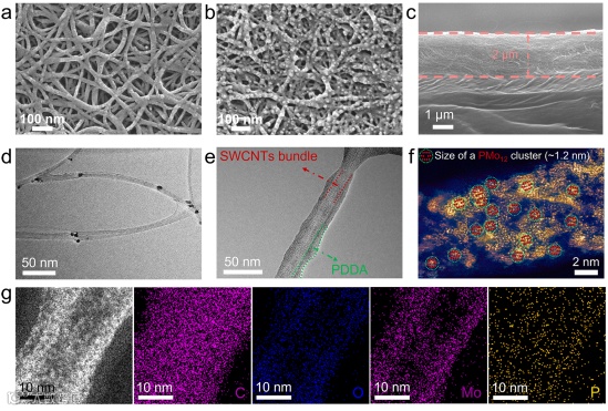 该工作使用气溶胶工艺(浮动催化剂化学气相沉积,FCCVD)直接生长SWCNTs,并通过气象抽滤同步构筑插指型微电极,在整个微电极构筑过程中无需溶剂参与,从而避免了溶剂法构筑微电极所需考虑的流变性等问题。随后,通过按压将微电极转移至PET基底上,使用双氧水对SWCNT基微电极进行功能化处理使SWCNTs表面具有丰富的带有负电的-OH官能团。然后以带正电的PDDA为桥梁一端与-OH相连,另一端与带负电的PMo12团簇相连,从而通过静电组装的方式将PMo12团簇均匀地锚定在SWCNT表面。形貌表征发现,锚定PMo12团簇前后,SWCNTs的形貌发生显著变化。未处理的SWCNTs表面光滑,具有纳米级孔隙,有助于电解质渗透和离子传输(图2a)。经PMo12处理后,SWCNTs表面变为粗糙颗粒状,这是由于PMo12通过静电相互作用锚定在SWCNTs表面(图2b)。TEM和HAADF-STEM分析证实,PMo12团簇聚集较少,比较均匀分散在SWCNTs表面(图2d-f, 支持信息图S4),EDS图像显示元素分布较为均匀,表明修饰效果良好。