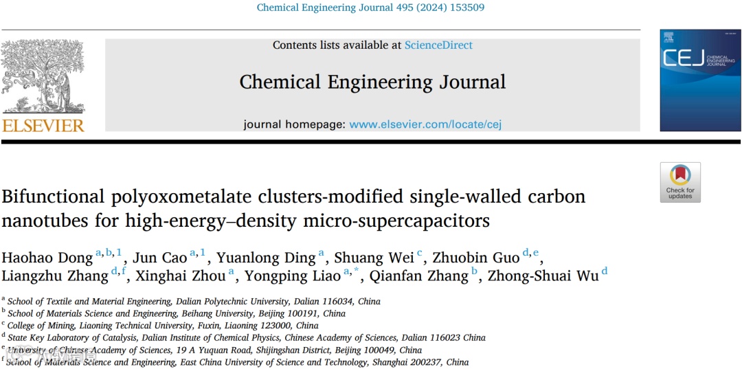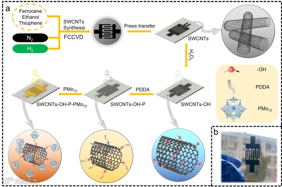 近日,大连工业大学廖永平在知名期刊Chemical Engineering Journal上发表题为“Bifunctional polyoxometalate clusters-modified single-walled carbon nanotubes for high-energy-density micro-supercapacitors”的研究性论文。在该工作中,作者通过气溶胶CVD(亦称FCCVD)法,一步构筑了单壁碳纳米管(SWCNTs)基微电极,这种微电极的制备方法避免了因溶液的参与而带来的问题,简化了微电极的制备工艺。随后,将磷钼酸(PMo12)团簇锚定SWCNTs的表面进行修饰用于MSCs。实验和理论计算表明,PMo12发挥了双重作用:(1)作为P型掺杂剂提高SWCNT电极的导电性,(2)作为赝电容材料以多电子转移过程显著提高MSC器件的比电容和能量密度。