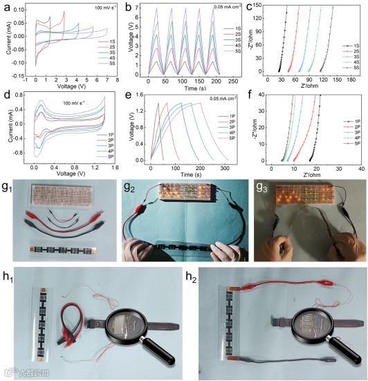 图5. 串并联集成的MSCs电化学测试及应用展示
