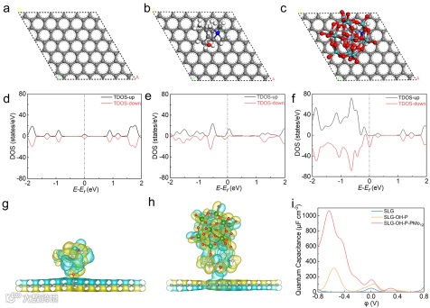 图4. 单层石墨烯(SLG),SLG经H2O2和PDDA处理,以及最终锚定PMo12团簇三种状态下进行的密度泛函理论计算。(Note:为了简化计算模型,以SLG替代SWCNT进行建模)。