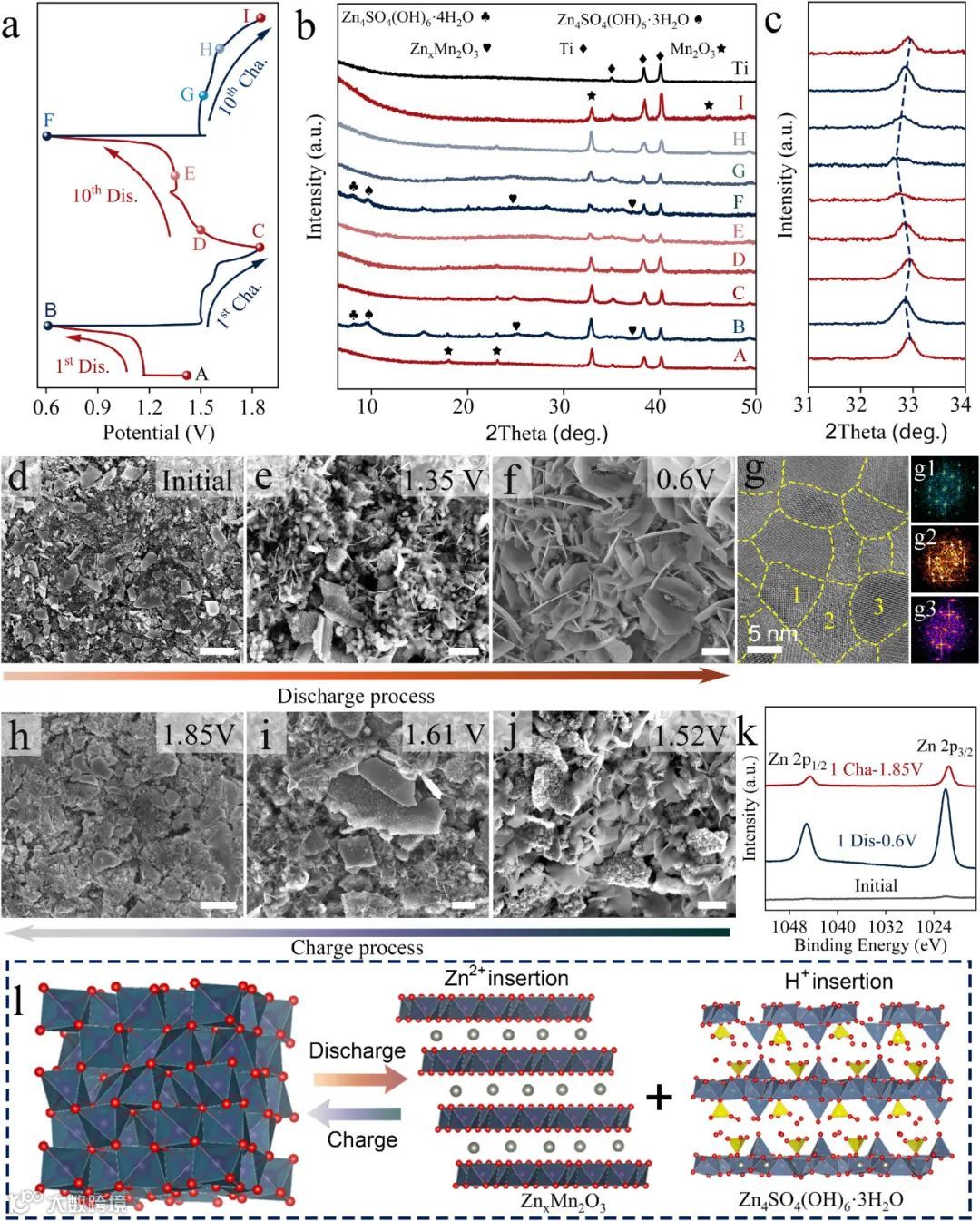 通过CV分析,富纳米晶界Mn₂O₃正极具有高的赝电容贡献,表明具有快速的动力学过程。因此,Mn₂O₃-GBs-H电极具有优异的倍率性能和循环性能,在0.1 A g-1和10 A g-1分别具有365 mAh g-1和108 mAh g-1的比容量。同时,在1 A g-1下经过1000次循环后具有91%的容量保持率。此外,在循环过程中,Mn₂O₃-GBs-H电极发生可逆相变生成层状的,并伴随着Zn2+和H+的可逆嵌入和脱出过程。