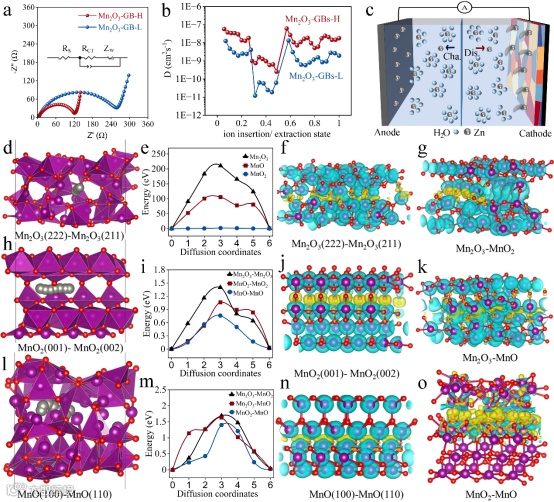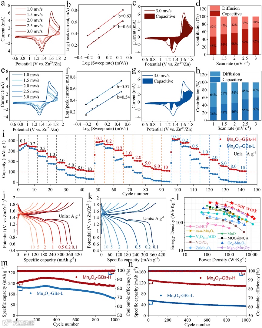 图3 Mn2O3-GBs-H和Mn2O3-GBs-L阴极的电化学动力学分析和电化学性能。