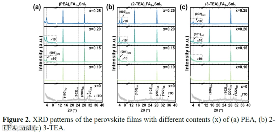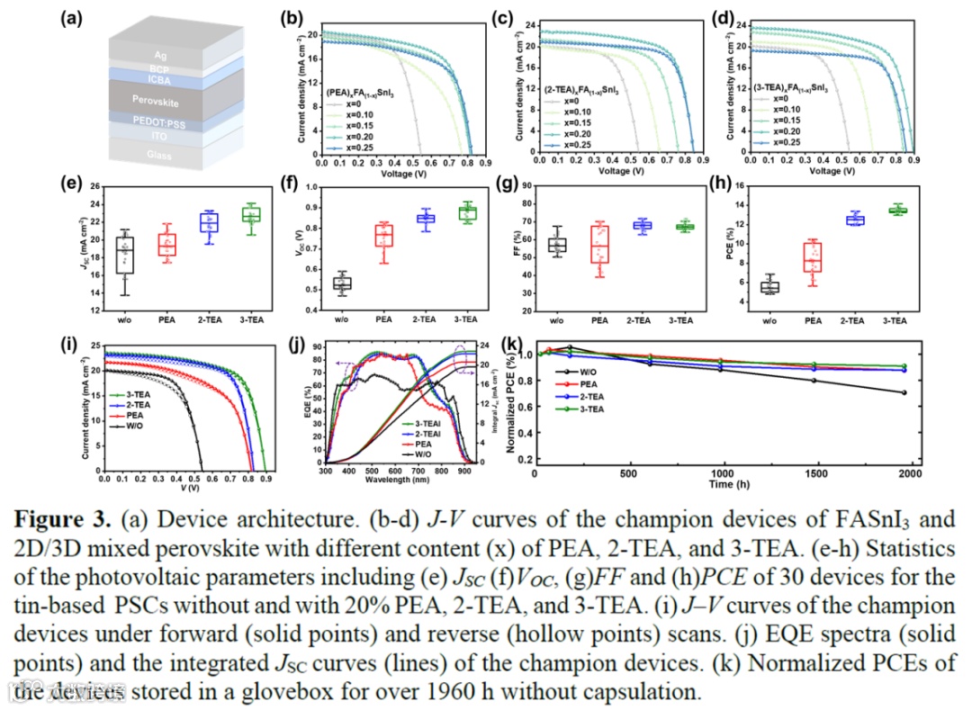 适量的2D间隔层(PEA、2-TEA、3-TEA)在锡基钙钛矿太阳能电池中可有效提高光电转换效率和稳定性。最佳效率在x=0.2时,基于PEA,2-TEA和3-TEA的器件最佳效率分别为10.71%、13.33%和14.16%。2D间隔层的引入有效提升了JSC,并显著减少了迟滞效应,提升了稳定性,基于3-TEA的器件性能表现最佳。