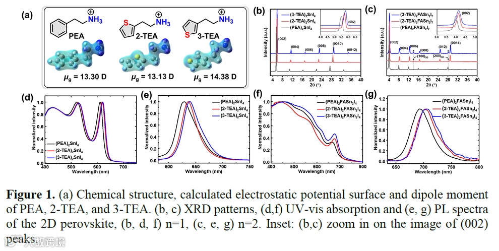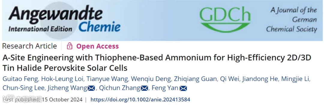 近日,来自香港理工大学的严锋教授与香港城市大学的张其春教授、中国科学院化学研究所的王吉政研究员合作,在国际知名期刊Angew. Chem. Int. Edit.上发表题为“A-Site Engineering with Thiophene-Based Ammonium for High-Efficiency 2D/3D Tin Halide Perovskite Solar Cells”的研究论文。报道了一种新的噻吩基铵(,2-(噻吩-3-基)乙铵,3-TEA),通过A位阳离子工程将其引入到基于FASnI3的钙钛矿中,实现了高效稳定的2D/3D型锡基钙钛矿太阳能电池。研究表明,与常规的苯乙铵PEA和2-(噻吩-2-基)乙胺(2-TEA)相比,3-TEA的能有效促进2D相中的载流子传输,显著提高器件的效率和稳定性。