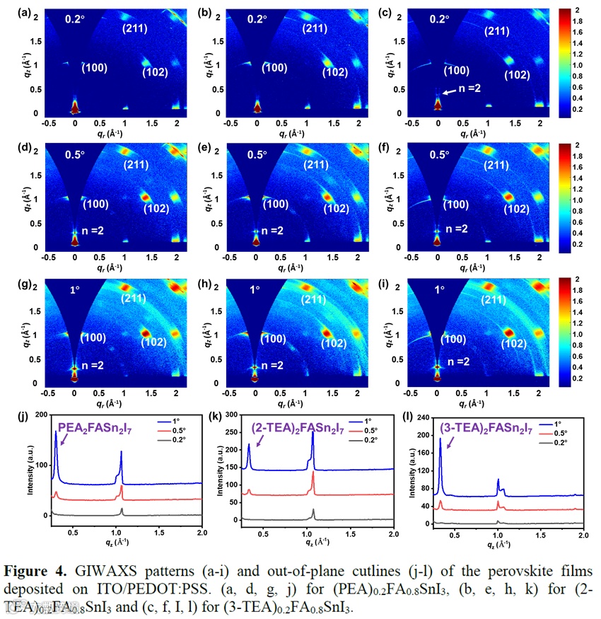 通过不同配比的钙钛矿(LXFA(1-X)SnI3,X=PEA,2-TEA,3-TEA)薄膜进行XRD和SEM分析表明,随着有机阳离子(PEA, 2-TEA, 3-TEA)含量的增加,薄膜的晶体结构和表面形貌发生显著变化。当2D间隔层含量X较低时主要形成的是n=2的钙钛矿相,增至X=25%时,出现了n=1钙钛矿相,可能对光伏器件性能产生负面影响。此外,(100)晶面峰值的FWHM最小值表明在特定配比下晶体质量最佳。钙钛矿的晶粒尺寸随阳离子含量增加而减小,薄膜表面变得更加平滑致密,但过高的阳离子含量会导致表面出现大片状结构和孔洞。针对X=20%薄膜的GIWAXS研究表明,仅有3-TEA 基薄膜表面存在 2D 钙钛矿相,有利于保护钙钛矿免受氧化;随着角度增加,2D 钙钛矿相在薄膜中出现并分布在中部和底部区域。结合UPS对能级的推算,这种至下而上2D/3D的堆积方式有利于激子的解离和传输,进而影响TPSCs器件的光伏性能。