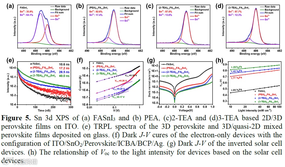 近年来,钙钛矿太阳能电池(PSCs)因其卓越的光伏性能和较低的制造成本,被认为是下一代光伏技术的有力候选者。然而,当前具有高效率的PSCs主要是基于铅(Pb)的卤化物钙钛矿。由于铅元素的重金属毒性,即使极少量的铅排放也会对生态环境构成重大风险。为了解决这一问题,非铅钙钛矿太阳能电池的研究极为重要。二价的Sn2+和Pb2+具有相似的外层电子构型和离子半径,以之制备的锡基钙钛矿具有适宜太阳能电池的带隙,符合Shockley-Queisser极限所定义的最佳范围。然而,由于Sn-5s轨道的能量较高,使得Sn2+易于氧化,同时锡基钙钛矿的快速结晶速度使薄膜质量和形貌的控制更加复杂,进而影响光伏性能。为了克服这些缺点,研究者一方面通过引入了SnF2、卤化肼等还原性添加剂以防止Sn2+的氧化。另一方面将具有大尺寸的有机铵离子引入到三维钙钛矿的A位,钝化缺陷的同时形成二维(2D)钙钛矿相,从而提升钙钛矿的光电性能和稳定性。然而,目前性能较好的有机配体大都是具有柔性烷基的铵类(如正丁胺、正己氨铵、丁二铵等)和具有芳香基团苯基的铵类(如苯基甲铵、2-苯乙胺(PEA)及其衍生物氟代苯乙氨、五氟苯氧乙铵等,然而基于其他芳香基团的有机铵阳离子在TPSCs中的应用却鲜有报道。