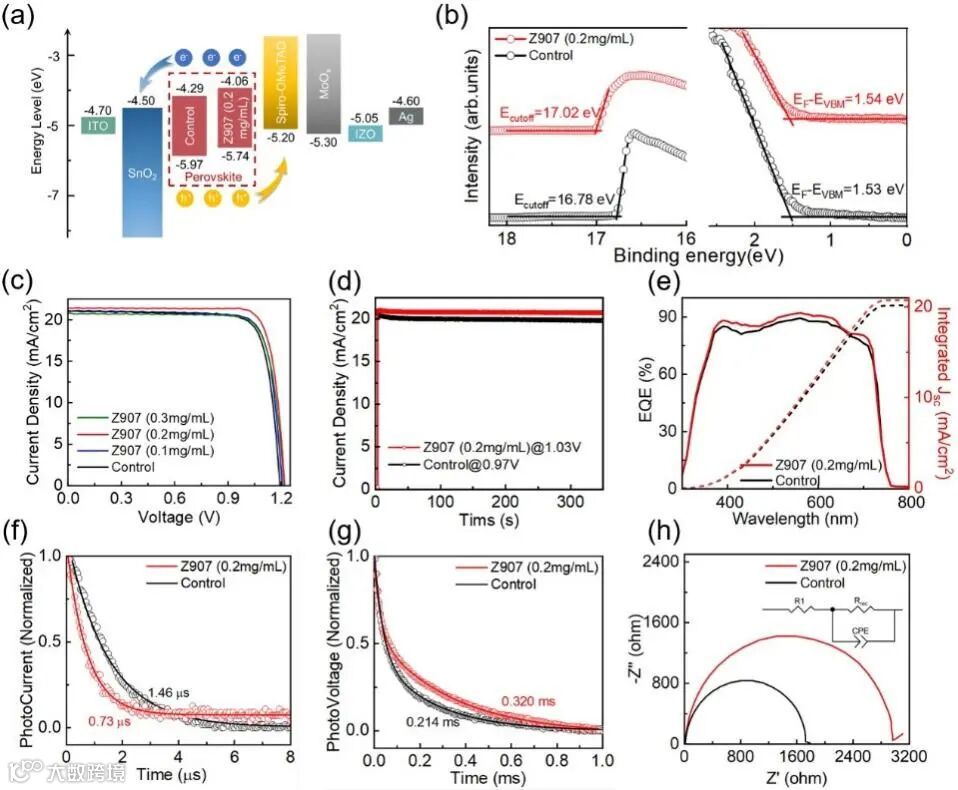 图2. (a)能带排布图,(b)标准条件和浓度为0.2 mg/mL Z907制备的钙钛矿薄膜的UPS能谱,(c)标准条件和不同浓度Z907溶液制备的最佳性能的半透明PSCs在RS下的J-V测试曲线,(d)最大功率点的稳态输出曲线,标准条件和浓度为0.2 mg/mL Z907制备的钙钛矿薄膜的(e)EQE光谱及积分电流曲线,(f)TPC曲线,(g)TPV曲线和(h)EIS曲线.