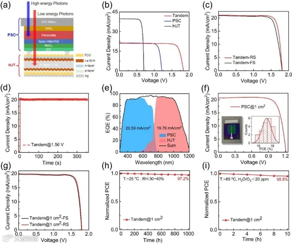 图3. (a)钙钛矿/HJT两端机械叠层太阳电池结构示意图,(b)HJT电池、半透明PSC及钙钛矿/HJT两端机械叠层太阳电池的J-V曲线,(c)钙钛矿/HJT两端机械叠层太阳电池在RS/FS下的J-V测试曲线,钙钛矿/HJT两端机械叠层太阳电池(d)在MPP处的稳态电流输出和(e)EQE光谱,(f)浓度为0.2 mg/mL Z907制备的最佳性能的半透明PSCs在RS下的J-V测试曲线,(g)有效面积为1 cm2的钙钛矿/HJT两端机械叠层太阳电池在RS/FS下的J-V测试曲线,有效面积为1 cm2的钙钛矿/HJT两端机械叠层太阳电池(h)在空气环境中储存1000 h和(i)N2环境中85℃加热10 h的PCE随时间衰减归一化曲线.