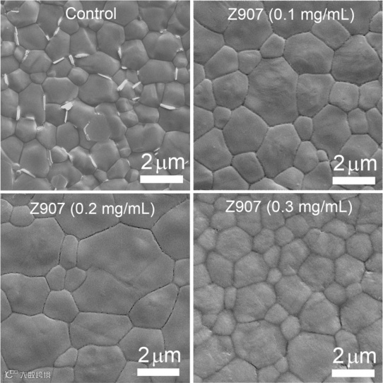 图1. 标准条件和不同浓度Z907溶液制备的钙钛矿薄膜的SEM图.