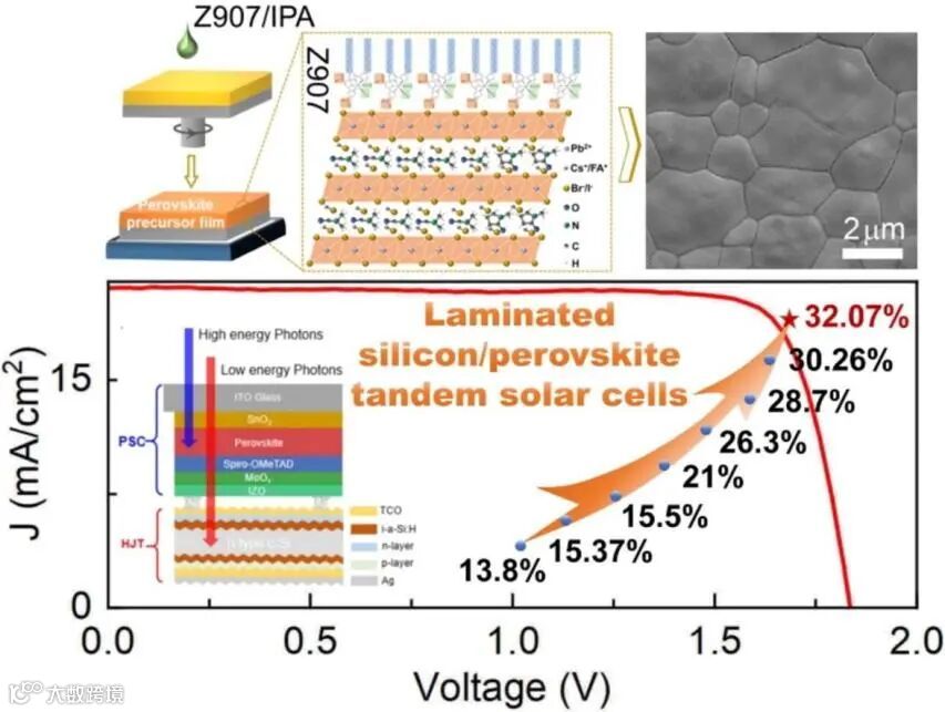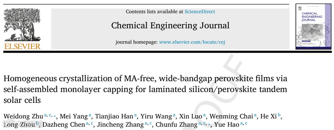 近日,来自西安电子科技大学的朱卫东、张春福教授在国际知名期刊Chemical Engineering Journal上发表题为“Homogeneous crystallization of MA-free, wide-bandgap perovskite films via self-assembled monolayer capping for laminated silicon/perovskite tandem solar cells”的文章。该文章采用Z907作为SAM层锚定结晶的策略为无MA宽带隙钙钛矿太阳电池及串联电池的发展提供了新的思路,并为其产业化应用奠定了基础。