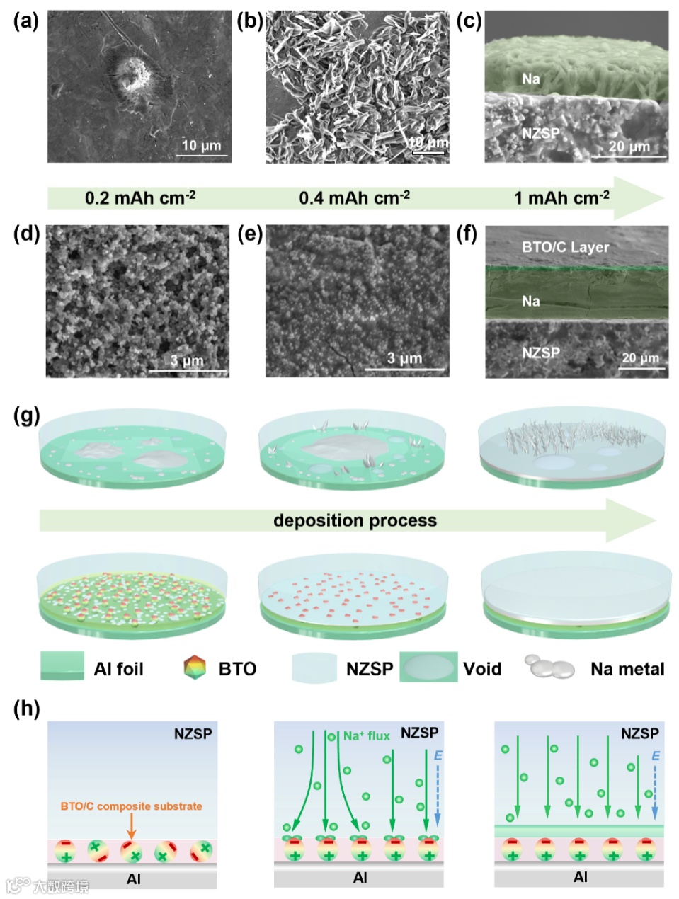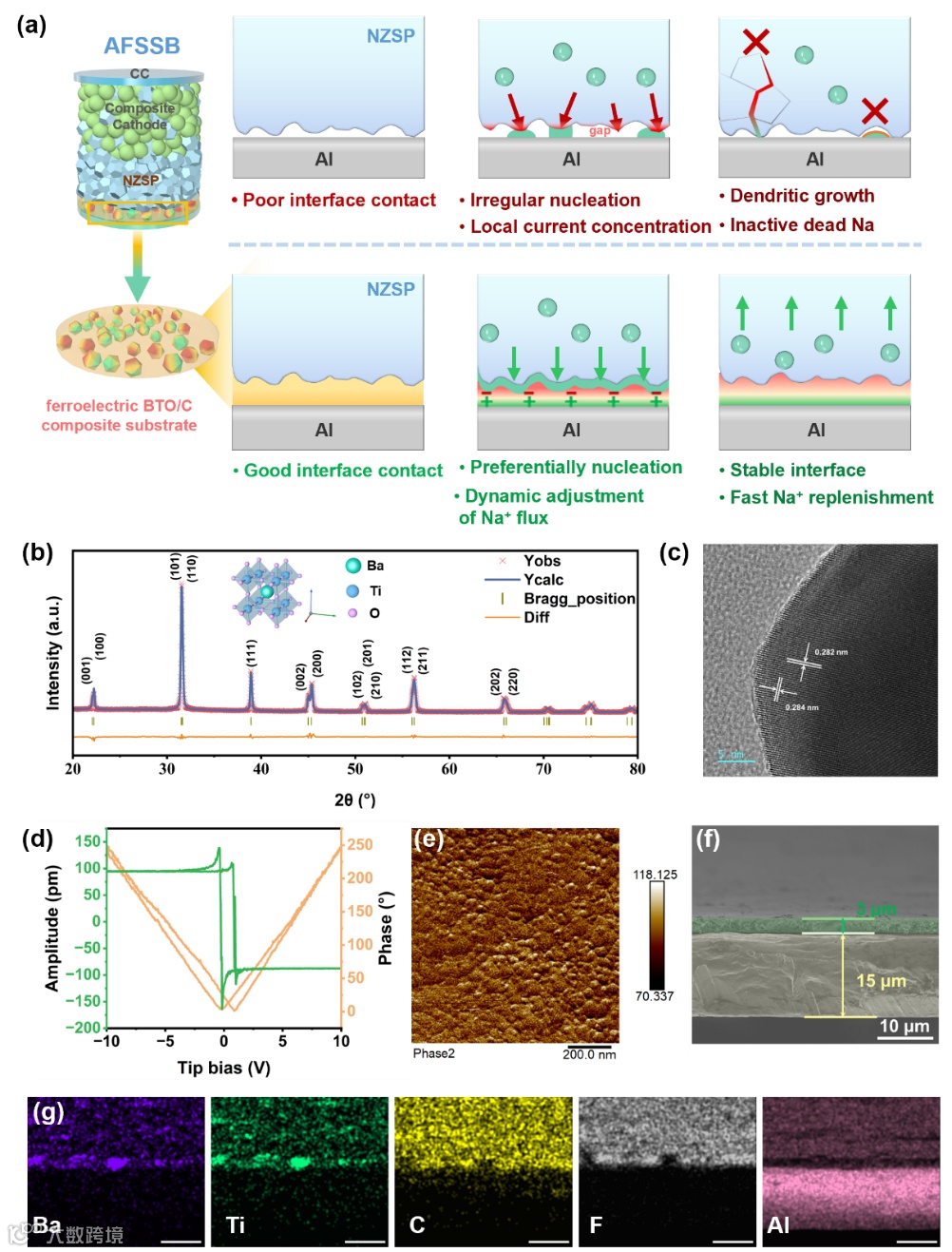 该研究提出了一种基于 NZSP的AFSSB结合韧性铁电复合基底的设计,该复合BTO/C铁电基底采用简单的方法获得,可作为无阳极固态电池中有效的成核缓冲层。它可以显著降低钠沉积的成核障碍,促进钠的共形沉积。这项工作不仅为AFSSBs的发展提供了新的思路,也为高能量密度固态电池的设计提供了重要的指导。