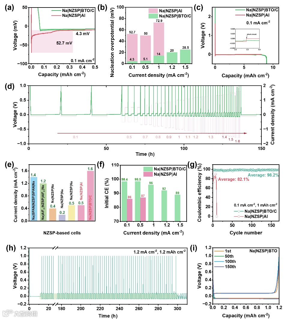 非对称电池采用钠作为对电极,以 NZSP 陶瓷作为电解质,裸Al箔、C涂层Al箔(C@Al)和 BTO/C 涂层Al箔(BTO/C@Al)作为集流体,分别为 Na|NZSP|Al,Na|NZSP|C和Na|NZSP|BTO/C。Na|NZSP|BTO/C展示出4.3 mV的极低成核过电位(0.1 mA cm-2)与显著增强的临界电流密度(1.6 mA cm-2)。即使在1.2 mA cm-2的高电流密度下,仍然具有优异的循环性能,沉积容量达180 mAh cm-2,稳定运行150个沉积/剥离循环,平均CE为99.7%。
