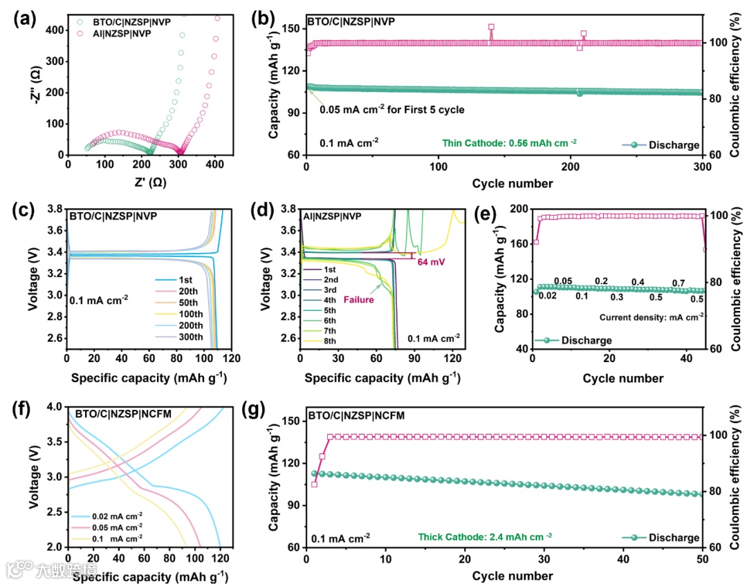 以 BTO/C@Al 和裸铝箔为集电极,NZSP 电解质和复合阴极为配对,组装了全电池。BTO/C | NZSP | NVP 在300个循环中保持接近100% 的高 CE,容量保持率为95.5% 。BTO/C | NZSP | NCFM 经过50次循环后保持86.6%的容量保持率。