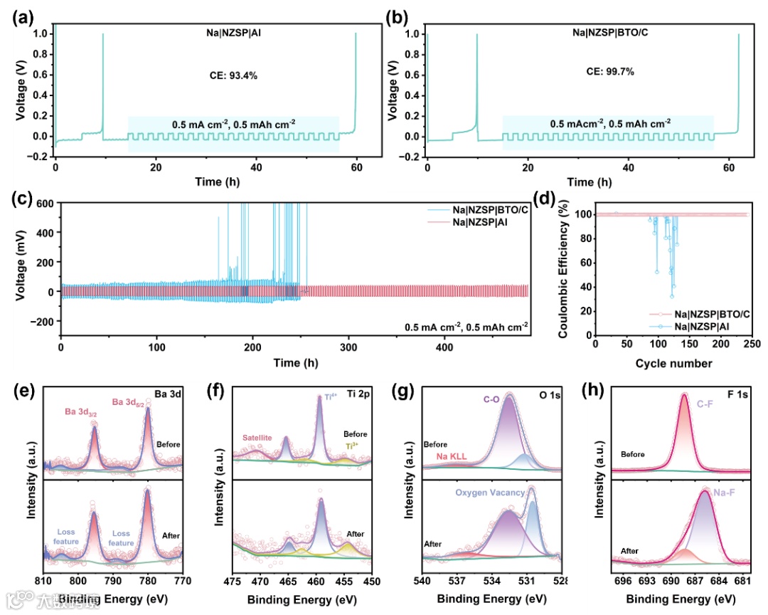 进一步精确测定沉积/剥离过程中的平均CEs,在0.5 mA cm-2电流密度下平均CE达到99.7%。BTO/C在预沉积后对称电池中表现出良好的循环稳定性,极化极小。循环前后的 XPS 测量进一步证明界面的稳定性。