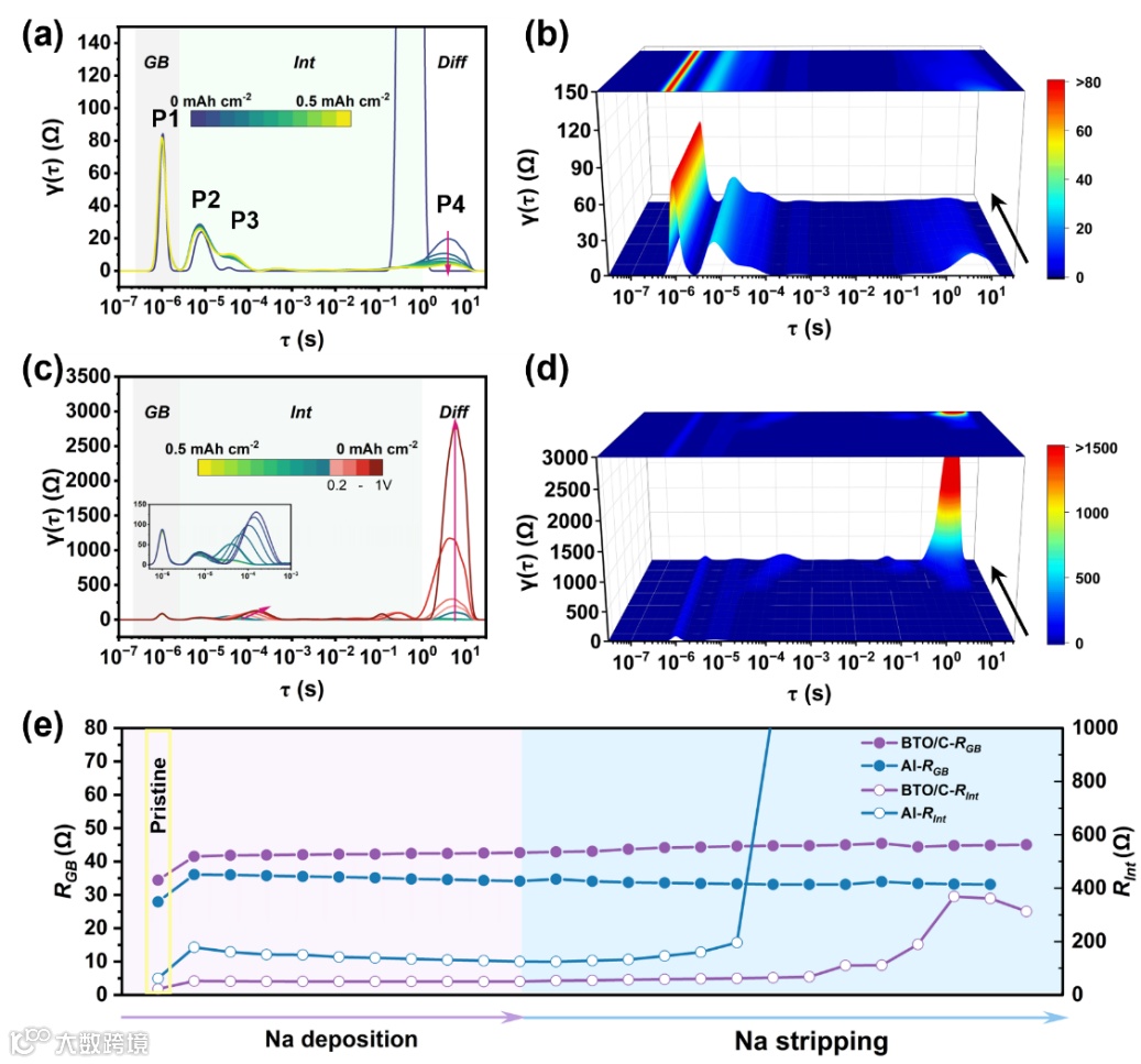 基于弛豫时间分布(DRT)方法,系统地分析了两种不对称电池在循环过程中的界面演化动力学。Na|NZSP|Al与Na|NZSP|BTO/C表现出相似的变化趋势,但是界面区(RInt)显示更强和更复杂的信号变化,意味着不利的副反应和复杂的界面演化。随着剥离过程的进行,扩散区不仅出现峰强的急剧增加,而且时间常数也出现波动。这表明负极一侧的接触损耗增加了电荷转移阻抗,这是由于空洞和非活性“死钠”的形成引起的。