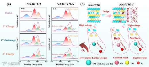 NNMCTO-S的异质结界面通过内置电场有效限制氧阴离子在表相向外迁移,抑制了氧气释放。此外,引入Mo形成更强的Mo-O共价键来稳定体相中晶格氧,显示出更高的氧氧化还原可逆性,实现双策略调控氧的氧化还原。