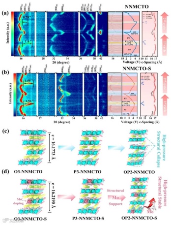 NNMCTO-S阴极表现出较小相变,且没有形成单斜畸变。Mo在TM层中的存在对稳定晶格氧的演化起着重要的作用,促进了Mo-O共价键的形成。此外,Mo引起的伪JTL效应有望通过稳定[MnO6]八面体来抵消典型的畸变。在高脱钠状态下,Mo6+由于其高价态且不参与电子转移,在过渡金属层内起固定作用,阻碍Mn从TM层迁移到邻近的钠层,抑制晶体结构的崩溃。