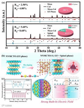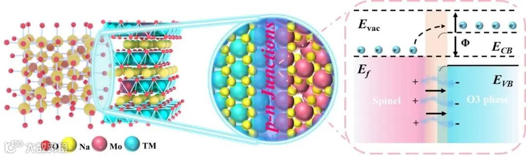 图1. Na[Ni0.3Mn0.55Cu0.1Ti0.05]O2@Na2MoO4异质结内形成内建电场