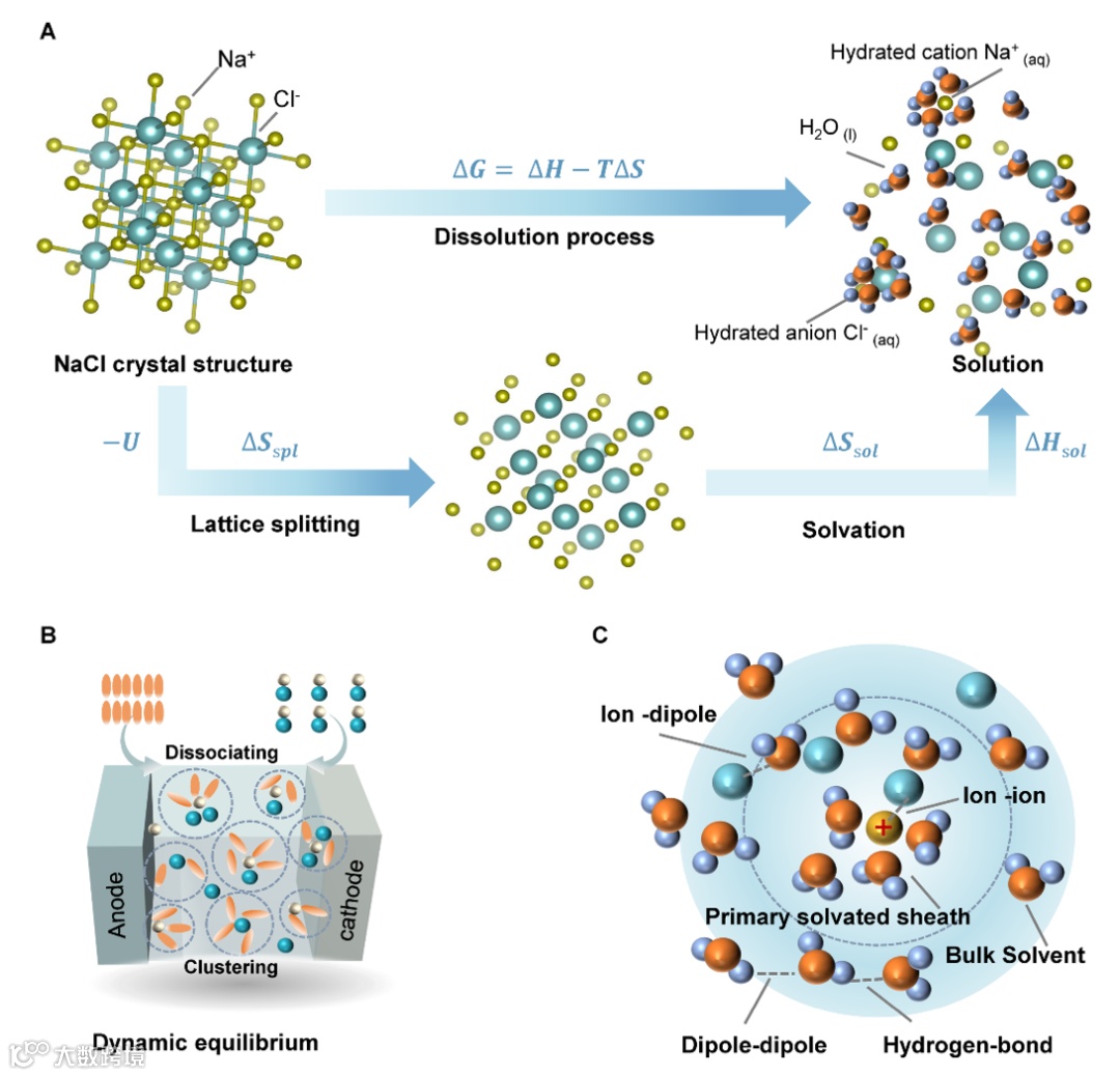 图1. 熵调谐的基础理论。(A) 电解质形成过程的示意图。(B) 与电解质形成过程相对应的热力学能量参数。(C) 溶剂化结构及其涉及的相互作用,包括离子-偶极、离子-离子和偶极-偶极相互作用。