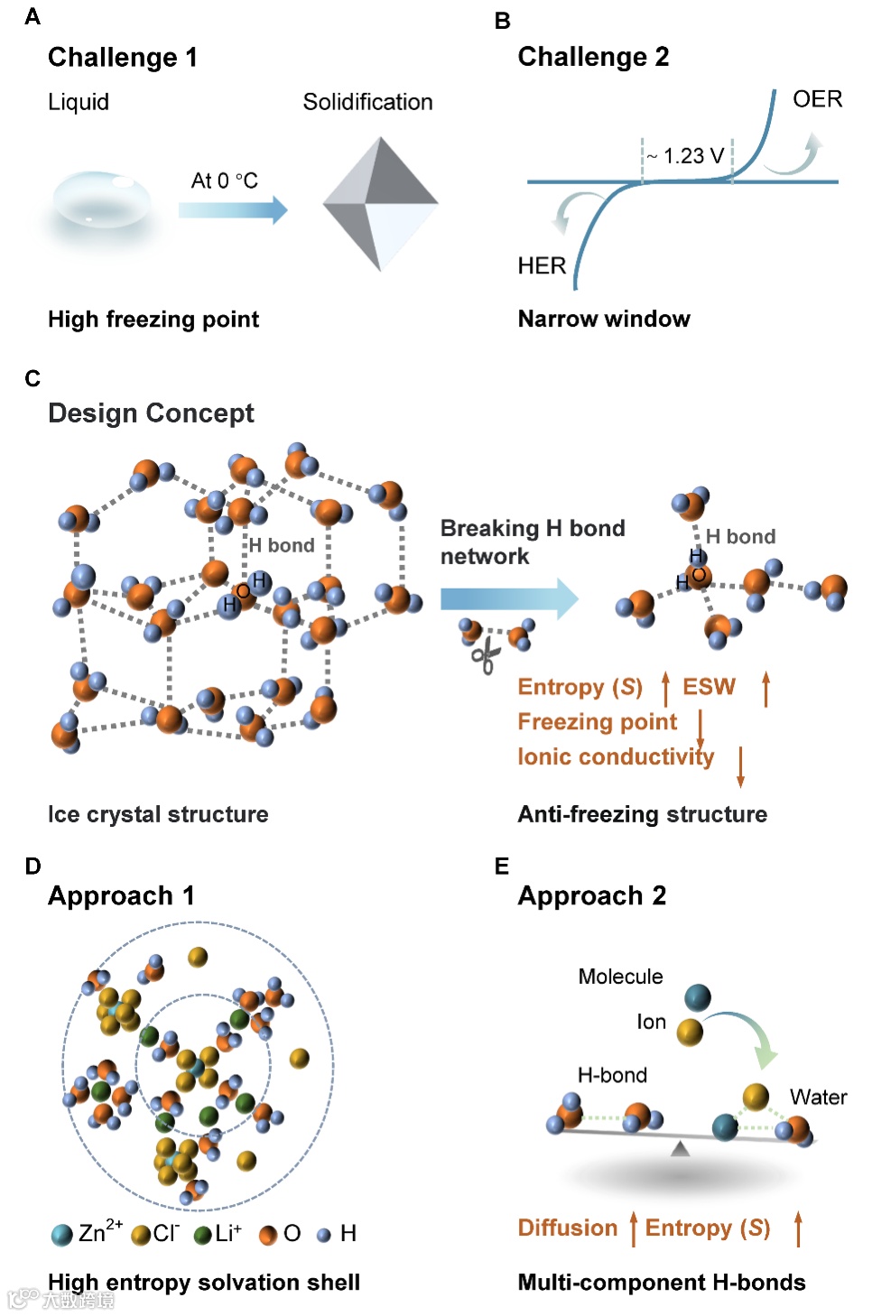 图2. 水系电解液的主要弱点、相应的熵调控设计概念及方法。主要弱点:(A) 原始水分子在0摄氏度时通过氢键形成四面体网络结构和(B) 水分子具有较窄的电化学稳定窗口。(C) 防冻水系电解液的设计指导思想。(D) 水系电解液的高熵溶剂化壳层。(E) 水系电解液的理论方向:平衡水分子之间的氢键与水分子与其他组分(如分子、离子)之间的氢键。