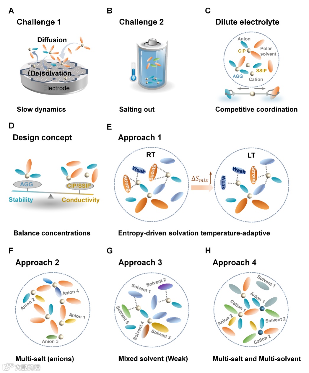 图3. 非水系电解液面临的主要挑战及相关的高熵调控策略。主要挑战:(A) 动力学缓慢 和 (B) 低温下的盐析问题。(C) 以传统稀溶液电解液为例,竞争性配位相互作用与由此产生的溶剂化结构之间的相互作用。(D) 阳离子溶剂化物种之间的平衡,即SSIPs(溶剂分离离子对)、CIPs(接触离子对)和AGGs(聚集体)。(E) 熵驱动的溶剂化温度适应性;通过混合 (F) 多种盐类,(G) 多种弱溶剂化溶剂,以及 (H) 多种盐和多种溶剂来制备高熵非水系电解液。