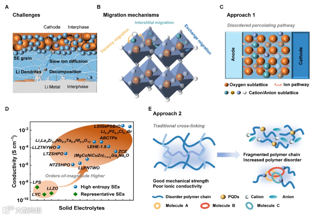 图4. 固态电解质的关键问题及相应的熵调控策略。(A) 固态电解质面临的问题与挑战。(B) 固态电解质的通用扩散机制。(C) 设计高熵固态电解质的方法1:掺杂金属阳离子以形成无序的渗透通道。(D) 传统的代表性固态电解质与已报道的高熵固态电解质离子电导率的总结比较。(E) 设计高熵固态电解质的方法2:设计碎片化聚合物链的分子结构。
