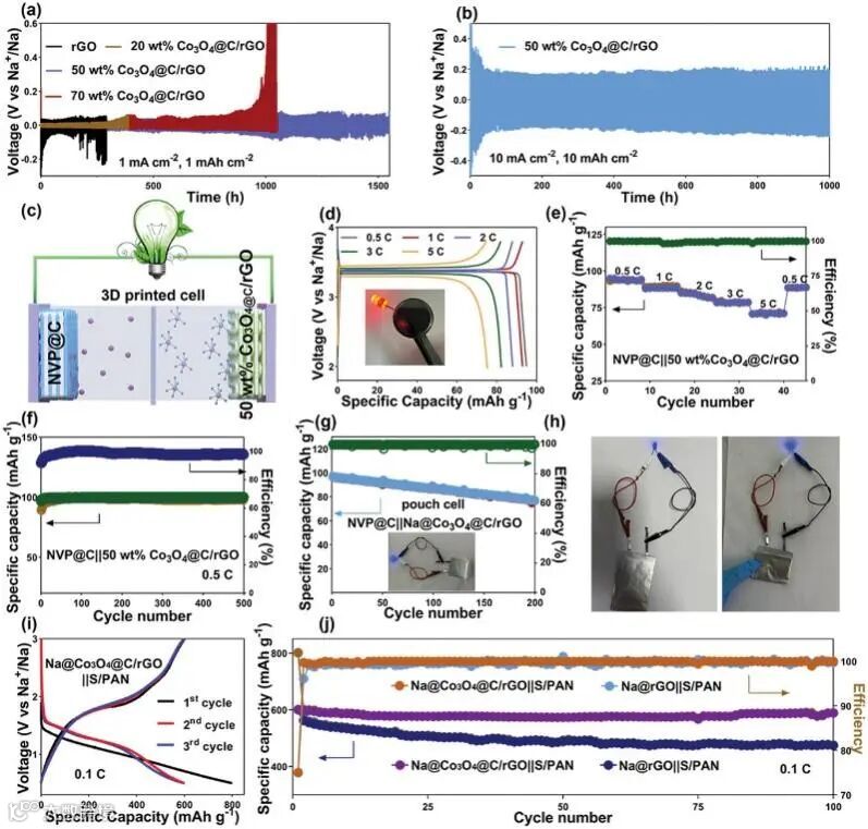 图2 a)对称电池的恒流放电/充电电压分布(Na@rGO||Na@rGO和Na@Co3O4@C/rGO||Na@Co3O4@C/rGO)电极)。b) Na@Co3O4Co3O4@C/rGO||Na@Co3O4@C/rGO电池在10 mA cm-2、10 mAh cm-2时的恒流放电/充电电压曲线。c)3D打印Na@Co3O4@C/rGO负极和Na3V2(PO4)3@C-rGO (NVP@C-rGO)正极的全电池示意图。d, e)恒电流在0.5-5 C电流密度范围内,Na@Co3O4@C/rGO||NVP@C-rGO电池的放电/充电电压曲线和倍率性能. f) Na@Co3O4Co3O4@C/rGO||NVP@C-rGO电池在0.5 C下的长期循环性能。g,h) 长循环和在各种折叠状态下软包电池的照明测试。i,j) Na@Co3O4@C/rGO||S/PAN电池的循环性能。