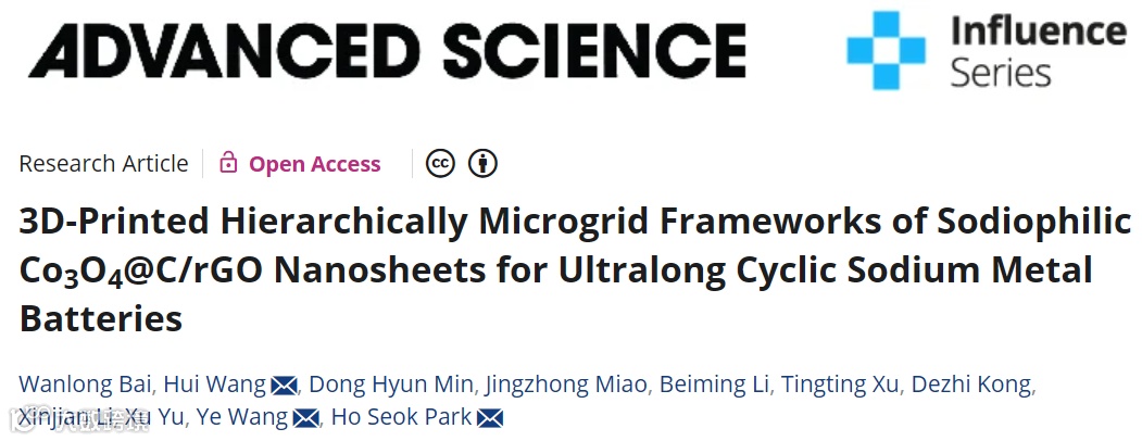 近日,来自郑州大学的王烨教授、王辉副教授与韩国成均馆大学的Ho Seok Park教授合作,在国际知名期刊Advanced Science上发表题为“3D-Printed Hierarchically Microgrid Frameworks of Sodiophilic Co3O4@C/rGO Nanosheets for Ultralong Cyclic Sodium Metal Batteries”的观点文章。该观点文章分析了三维导电框架与亲钠过渡金属氧化物/rGO构造的钠金属负极的循环性能。同时利用原位TEM深入探究了钠金属的沉积过程和机理。