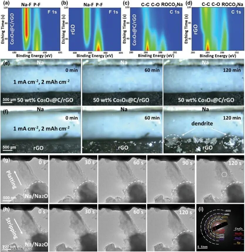 图1 a) 50 wt.% Co3O4@C/rGO和b) rGO宿主表面的F 1s XPS深度剖面。c) 50 wt.% Co3O4@C/rGO和d) rGO宿主表面的C- 1s 深度XPS剖面。1 mA cm-2下Na沉积的原位光学显微镜图像e) 3D打印50 wt.% Co3O4@C/rGO和f) rGO电极.g,h) 50 wt.% Co3O4@C/rGO薄片表面在不同时间下沉积/剥离Na金属的原位TEM表征。i) 3D打印的50 wt.% Co3O4@C/rGO金属钠沉积的SAED图像。