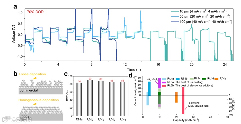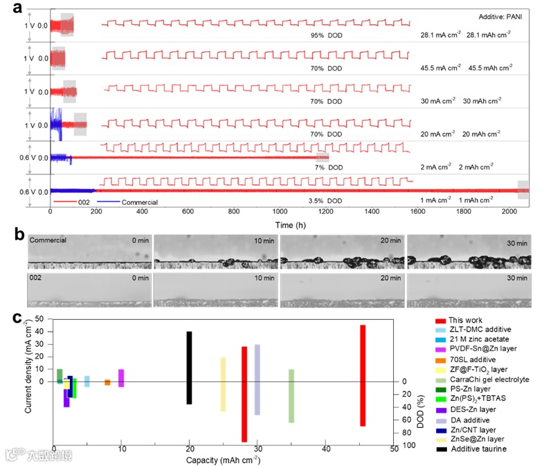 002箔能延缓了Zn2+的界面消耗速率,实现了界面处阴离子的固定和富集,从而抑制了Zn2+的浓度极化和SO42-枯竭区的形成。因此,在循环过程中,锌沉积的电化学反应动力学较慢,为(002)晶体表面的Zn2+积累提供了更多的时间,这有利于层状生长,从而获得堆叠的片状形貌,而没有伴随的HER。即使在70% DOD的最极端条件下,其特点是高电流密度(45.5 mA cm-2)和大量面积容量(45.5 mAh cm-2)的特殊组合,002箔的完整性和质地仍然保持不变。最初的形状保持不变,(002)面保持其独特的外观。通过在电解质中引入微量聚苯胺(PANI),进一步提高了其优异的性能,DOD高达95%。