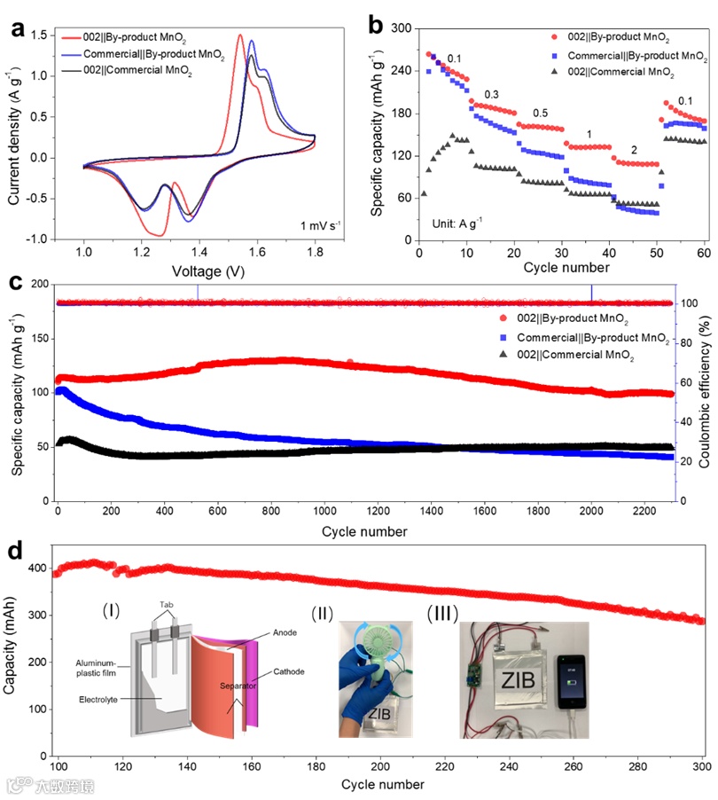 图5. 99% Zn (002) RTC负极和副产MnO2正极的全电池电化学性能。
