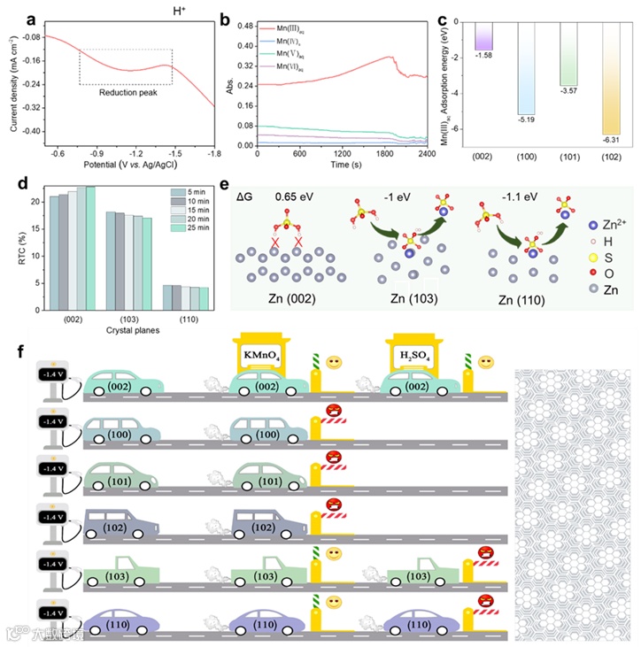 通过对Zn电沉积电位分析发现KMnO4的还原峰电位负得多,表明KMnO4的还原产物对Zn(002)平面的选择性生长起着建设性的作用并作用于(100)、(101)和(102)。此外,发现H+作用于 (103)和(110)。在Mn(III)aq和H+共同作用下得到99% Zn (002) RTC。