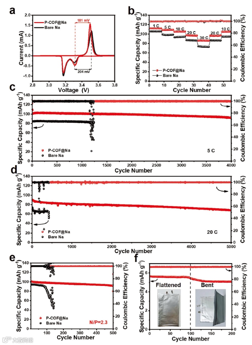 P-COF规则的一维孔道和磷酸官能团在保护钠负极的同时,为钠离子提供了快速传输通道。因此所组装的全电池具有出色的倍率性能基长循环性能。即使在20 C的大倍率条件下也可以稳定循环5000圈以上。控制N/P比为2.3时,全电池可以稳定循环超过500圈而没有明显的容量衰减。