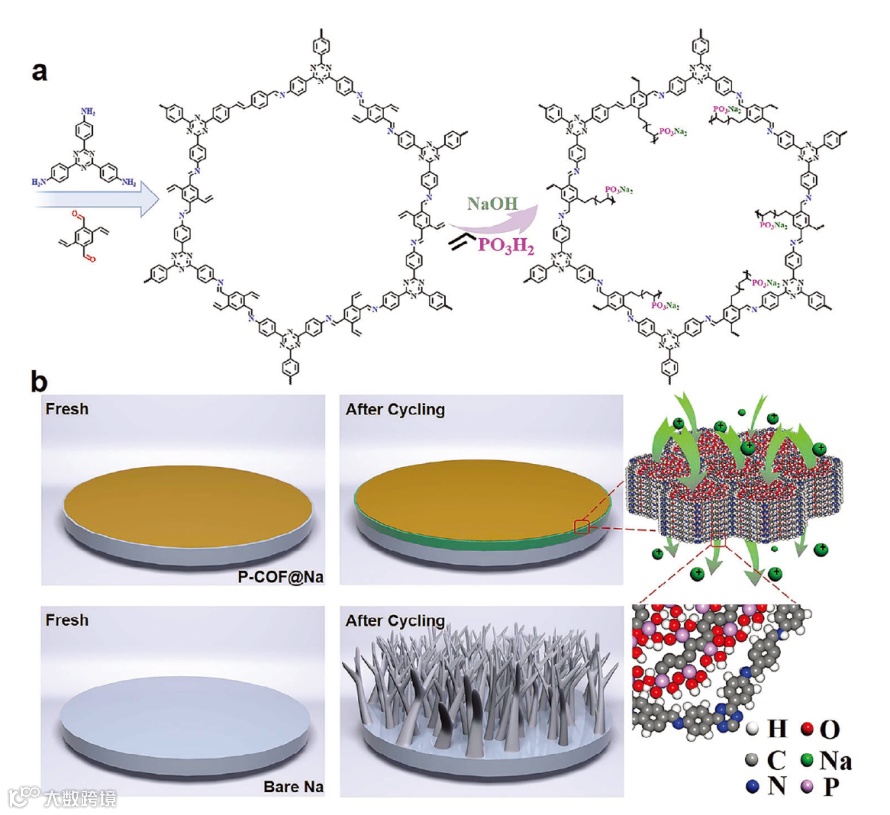 常规酯类电解液在与金属钠接触时,即会产生副反应,产生二氧化碳、乙烯等气体,劣化并破坏SEI膜,并且在电化学循环过程中持续恶化,导致低性能以及较大安全隐患。共价有机框架材料具有规则的一维孔道结构以及可功能化修饰的优势,可以在钠金属表面构建具有高速离子传输通道的稳定人造SEI膜,以提高钠金属的循环稳定性以及倍率性能。同时,在其上修饰的磷酸官能团可以在循环过程中原位生成无机磷酸钠,能够有效提高离子传输通量、抑制枝晶生长。